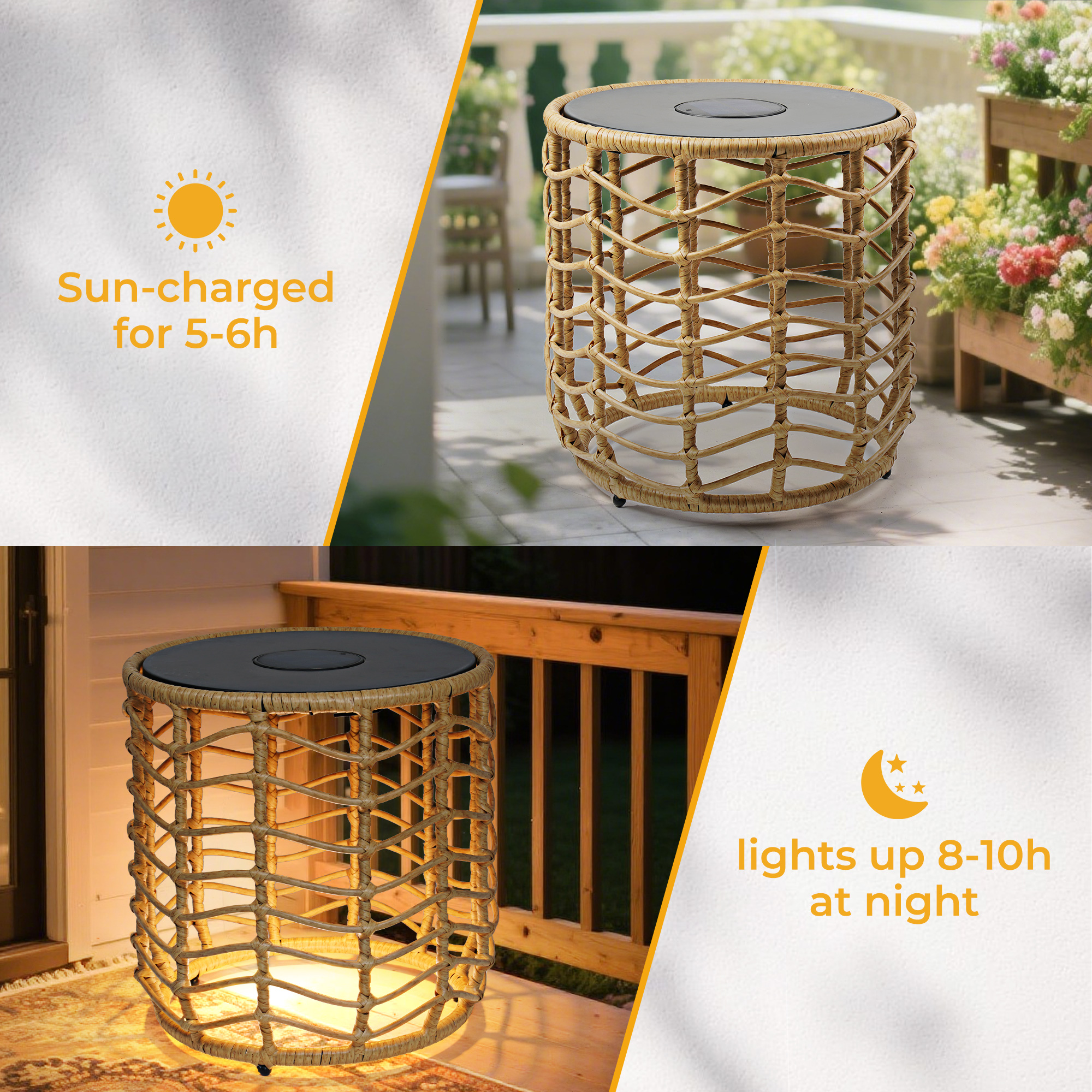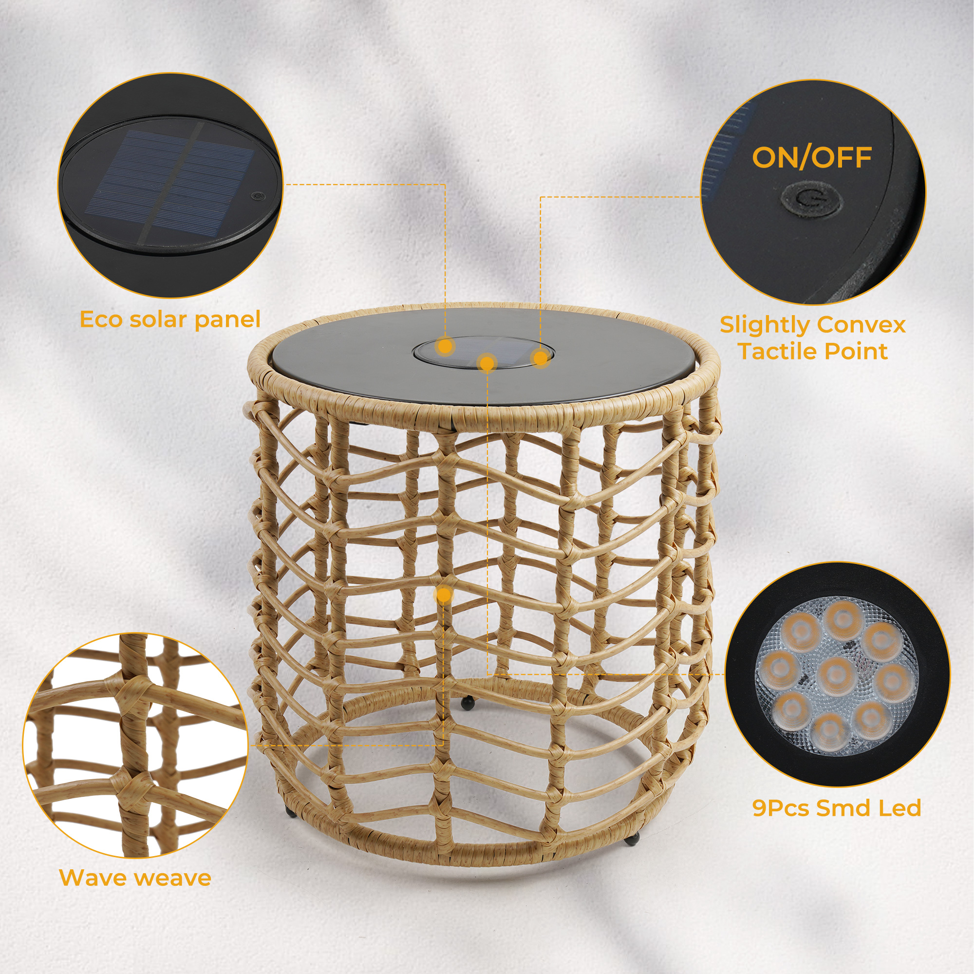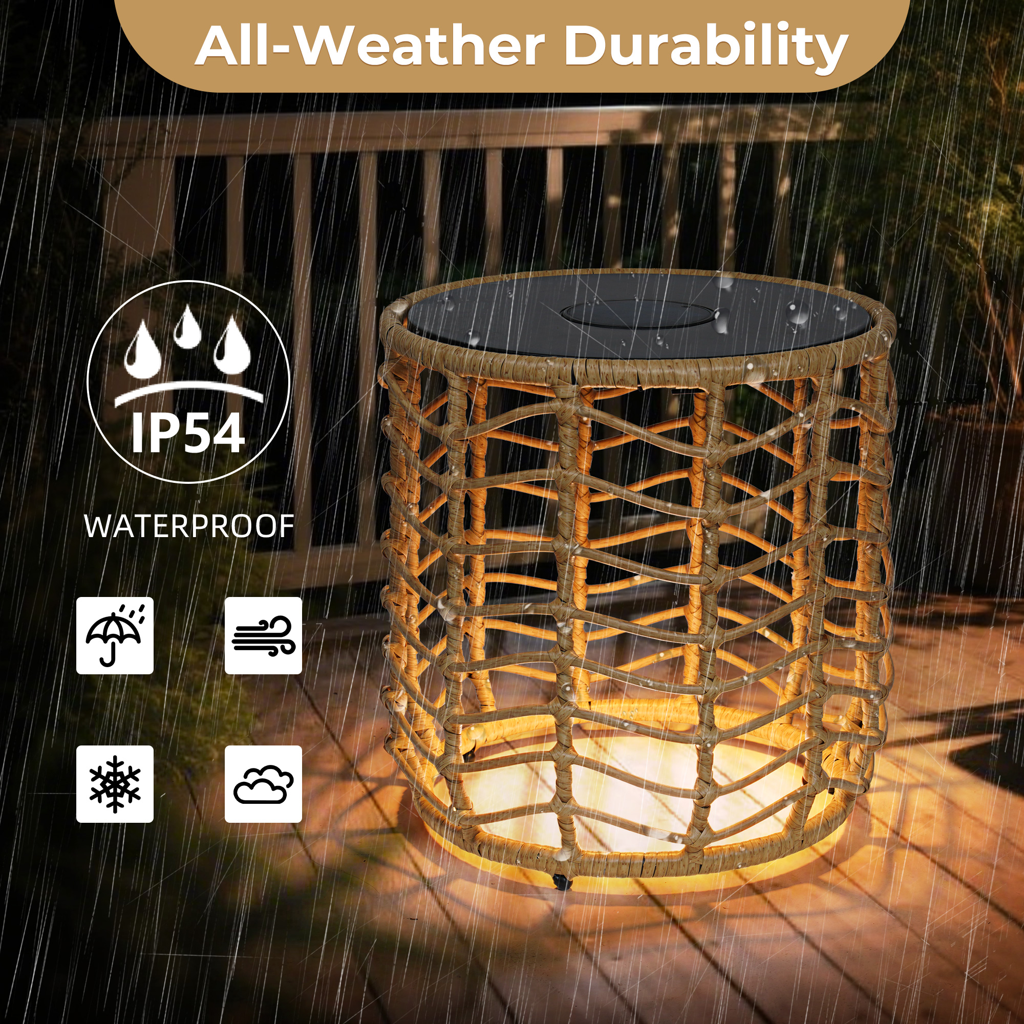 Waterproof and durable: The Wave boasts an IP54 waterproof rating, ensuring its resilience in various outdoor weather conditions, with a handwoven wicker that is rated for 1500 UV hours and artfully woven over a rust-resistant, e-coated and powder-coated steel frame.