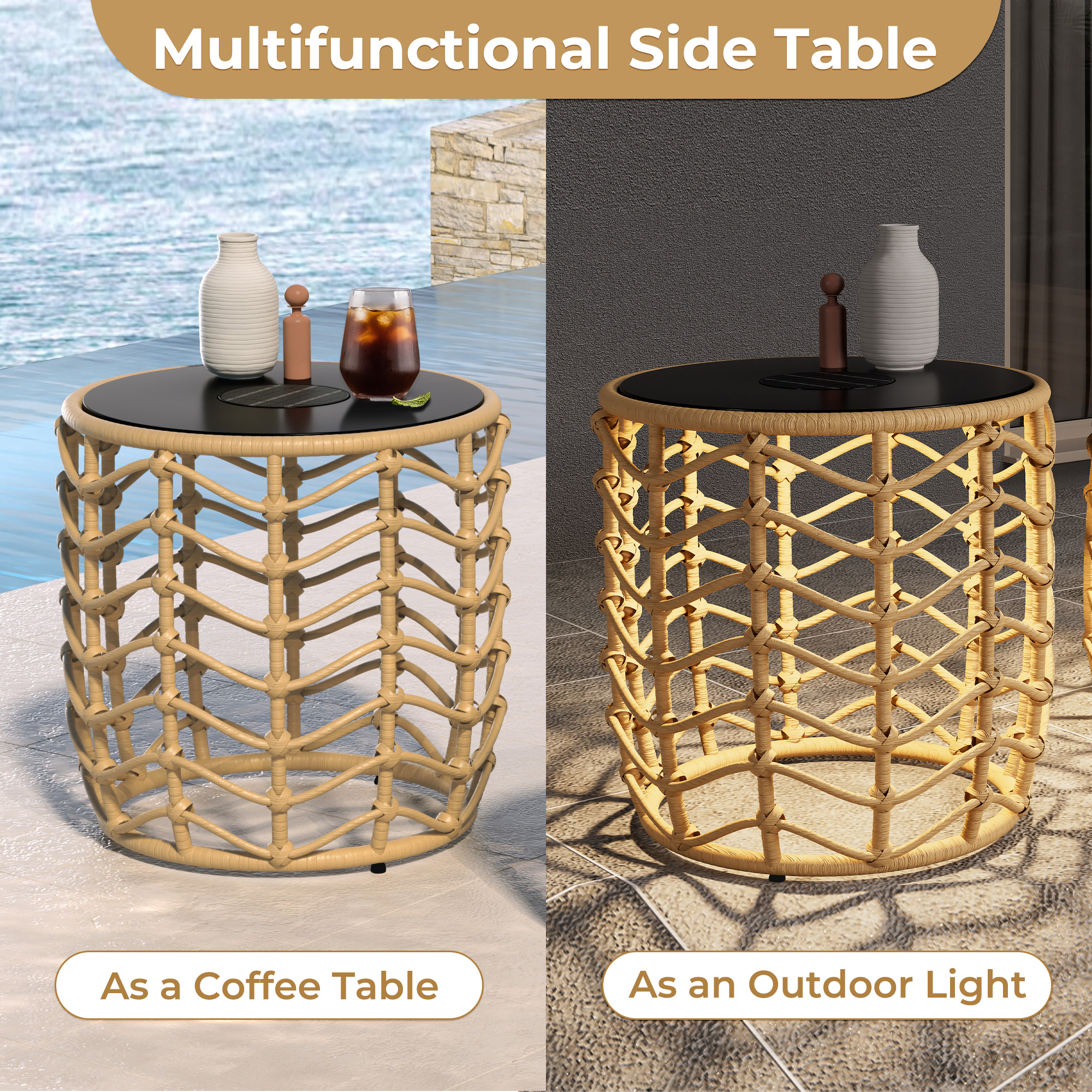 EVERITE Outdoor Wave Wicker End Tables Set of 2 Built-in Solar Lights,Black,$199.99